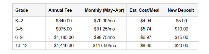 - Annual Rate $1,200/ year (August 2025 thru May 2026)